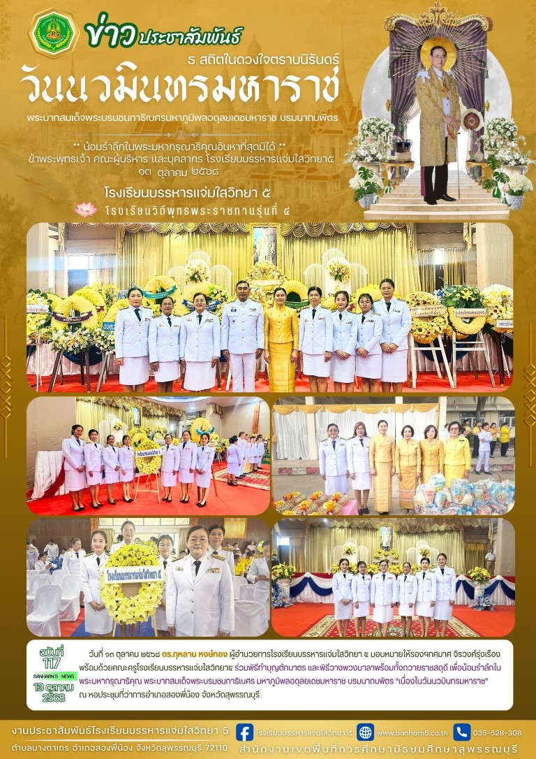 คณะครูโรงเรียนบรรหารแจ่มใสวิทยา๕ ร่วมพิธีทำบุญตักบาตร และพิธีวางพวงมาลาพร้อมทั้งถวายราชสดุดี เพื่อน้อมรำลึกในพระมหากรุณาธิคุณ พระบาทสมเด็จพระบรมชนกาธิเบศร มหาภูมิพลอดุลยเดชมหาราช บรมนาถบพิตร “เนื่องในวันนวมินทรมหาราช” ณ หอประชุมที่ว่าการอำเภอสองพี่น้อง จั