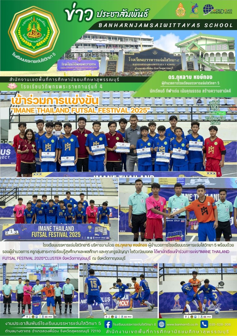 ดร.กุหลาบ หงษ์ทอง ผู้อำนวยการโรงเรียนบรรหารแจ่มใสวิทยา 5 พร้อมด้วยรองผู้อำนวยการ ครูกลุ่มสาระการเรียนรู้สุขศึกษาและพลศึกษา นำนักเรียนเข้าร่วมการแข่ง"IMANE THAILAND FUTSAL FESTIVAL 2025"CLUSTER จังหวัดกาญจนบุรี  ณ จังหวัดกาญจนบุรี