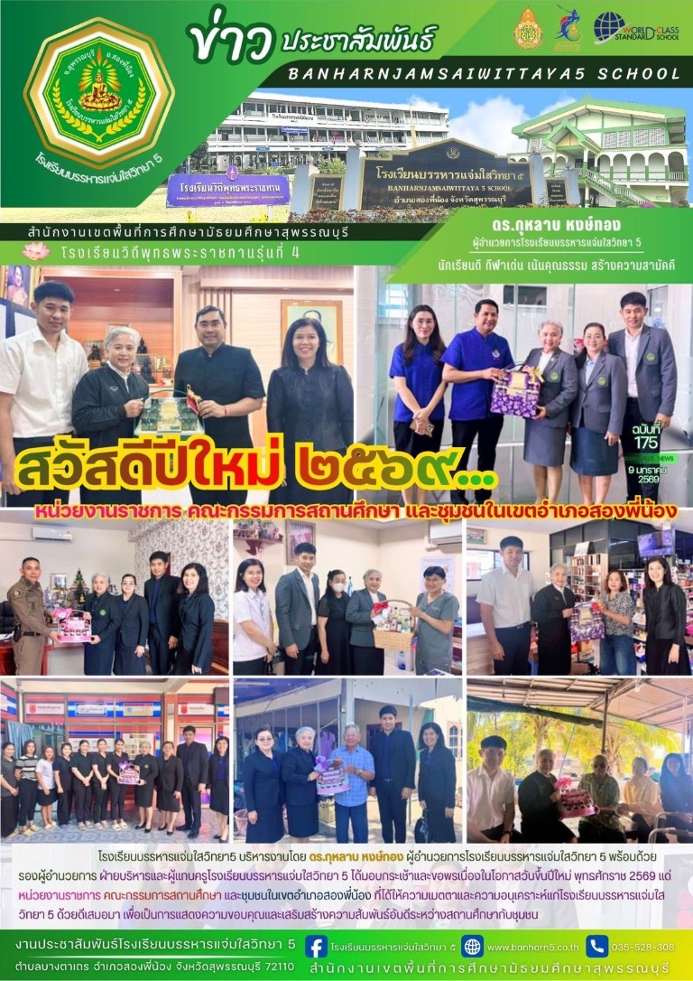 ร.กุหลาบ หงษ์ทอง ผู้อำนวยการโรงเรียนบรรหารแจ่มใสวิทยา 5 พร้อมด้วยรองผู้อำนวยการ ฝ่ายบริหารและผู้แทนครู มอบกระเช้าและขอพรเนื่องในโอกาสวันขึ้นปีใหม่ พุทธศักราช 2569 แด่หน่วยงานราชการ คณะกรรมการสถานศึกษา และชุมชนในเขตอำเภอสองพี่น้อง