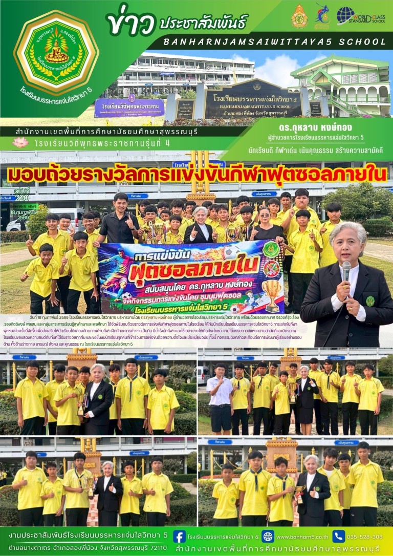กลุ่มสาระการเรียนรู้สุขศึกษาและพลศึกษา ได้จัดพิธีมอบถ้วยรางวัลการแข่งขันกีฬาฟุตซอลภายในโรงเรียน ให้กับนักเรียนโรงเรียนบรรหารแจ่มใสวิทยา5 การแข่งขันกีฬาฟุตซอลในครั้งนี้จัดขึ้นเพื่อส่งเสริมให้นักเรียนได้แสดงศักยภาพด้านกีฬา ฝึกทักษะการทำงานเป็นทีม