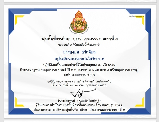 ครูผู้ปฏิบัติตนเป็นแบบอย่างที่ดีในด้านคุณธรรม จริยธรรม กิจกรรมคุรุชน คนคุณธรรม ประจำปี 2566 ตามโครงการโรงเรียนคุณธรรม สพฐ. ระดับเขตตรวจราชการ |